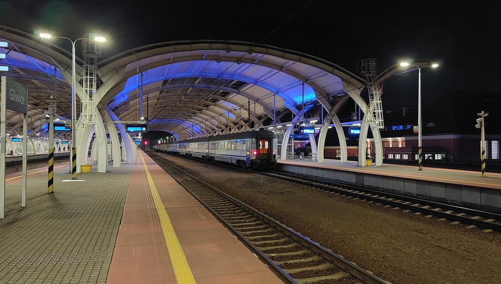 Perony dworca wieczorową porą, 21.02.2025r. Gliwice.