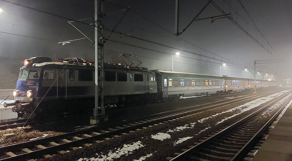 EP07-1005 z składem pociągu IC Halny relacji Zakopane – Poznań, 24.01.2025r. Żory.