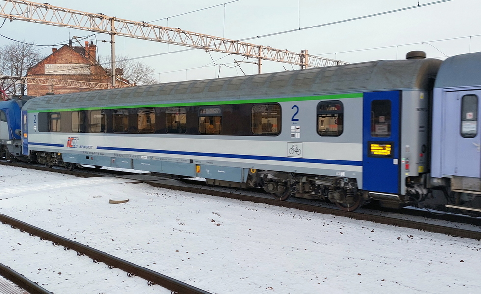 Wagon pasażerski 2 klasy typu 111Arow 51 51 84-70 012-5 B9nopuvz w składzie TLK Uznam relacji Świnoujście – Kraków Główny, 20.01.2018r. Gliwice.