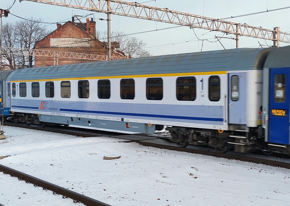 Wagon osobowy 1 klasy typu 140A 50 51 19-78 269-4 A9nouz w składzie IC Barnim relacji Katowice – Świnoujście, 26.01.2017r. Gliwice.