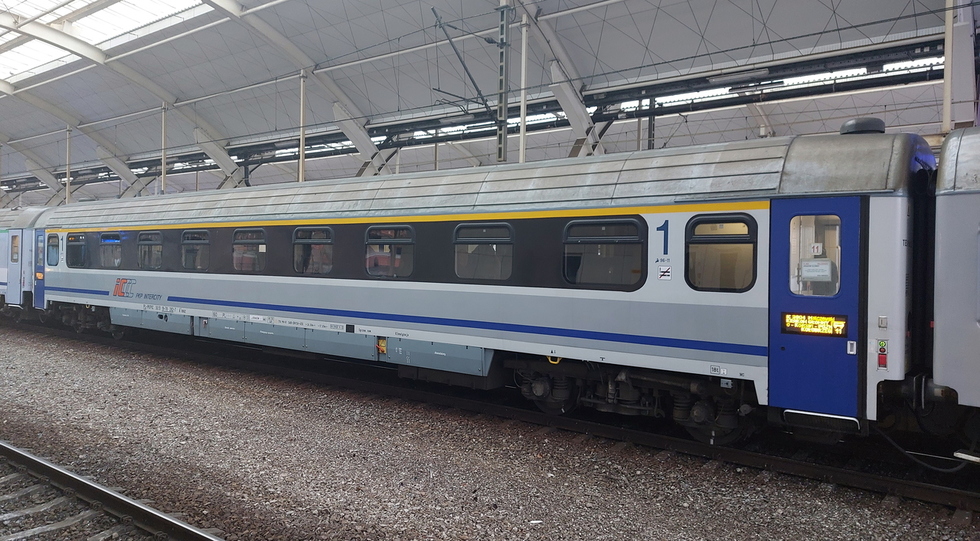 Wagon pasażerski 1 klasy typu 140A 50 51 19-70 702-2 A9nouz w składzie IC Heweliusz relacji Wrocław Główny – Gdynia Główna, 15.10.2017r. Wrocław Główny.
