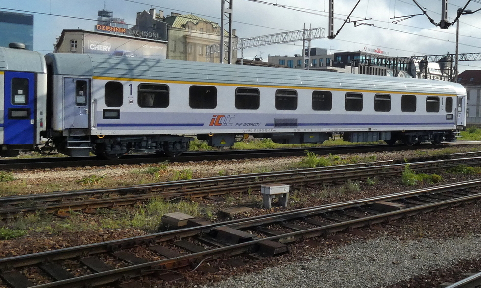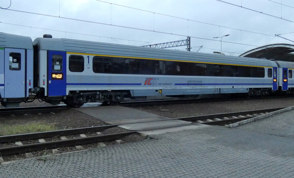 Wagon pasażerski 1 klasy typu 140A 50 51 19-78 273-6 A9nouz w składzie IC Barnim relacji Katowice – Świnoujście, 20.08.2017r. Gliwice.