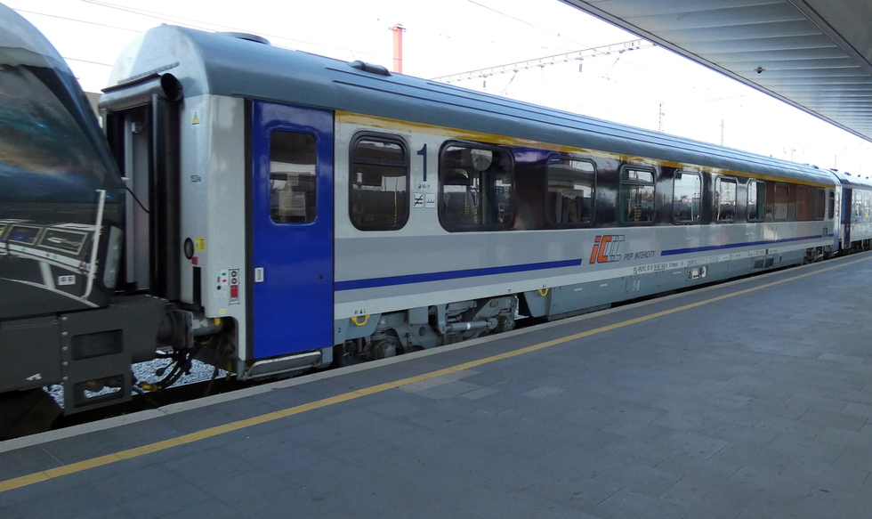 Wagon pasażerski 1 klasy typu 152A 61 51 19-90 032-7 A9mnopuz za EIP w relacji Gdynia Główna – Gliwice, 05.01.2018r. Gliwice.