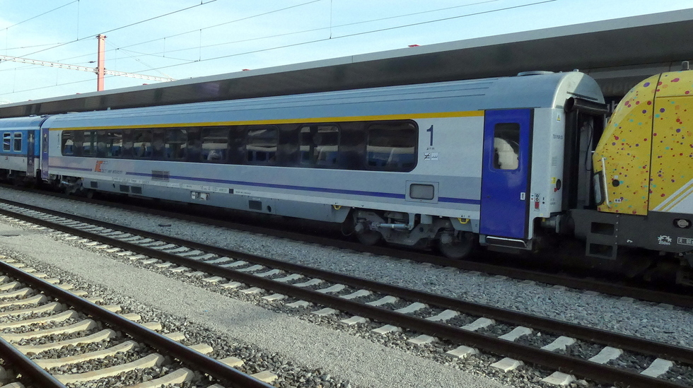 61 51 19-90 028-5 A9mnopuz wagon pasażerski 1 klasy typu 152A w składzie EC Batory-Bathory relacji Budapest-Nyugati – Warszawa Wschodnia, 15.09.2019r. Bohumin.