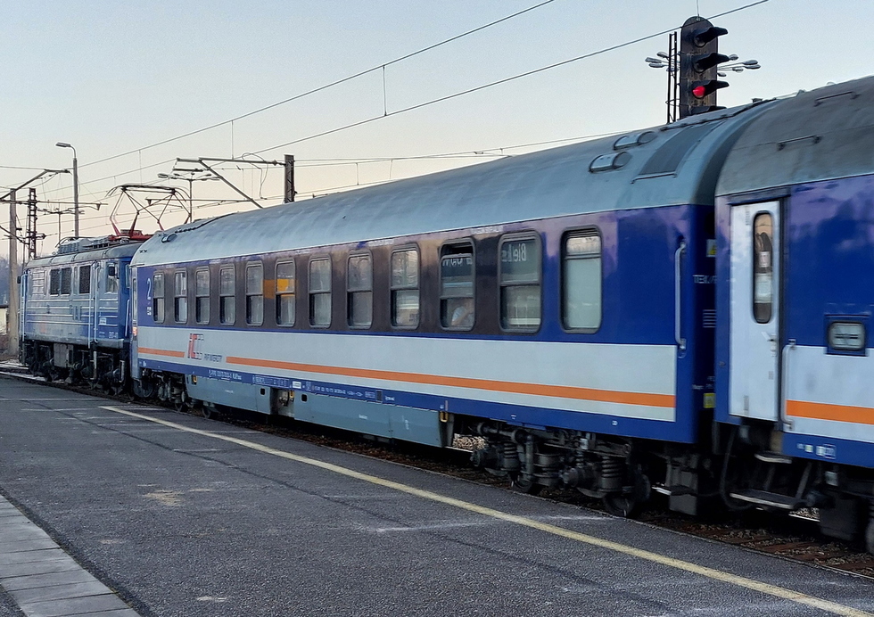 Wagon sypialny typu Görlitz81 52 51 70-70 052-6 serii WLAB10mouz w składzie TLK Uznam relacji Śwonoujście – Kraków Główny, 19.01.2018r. Gliwice.