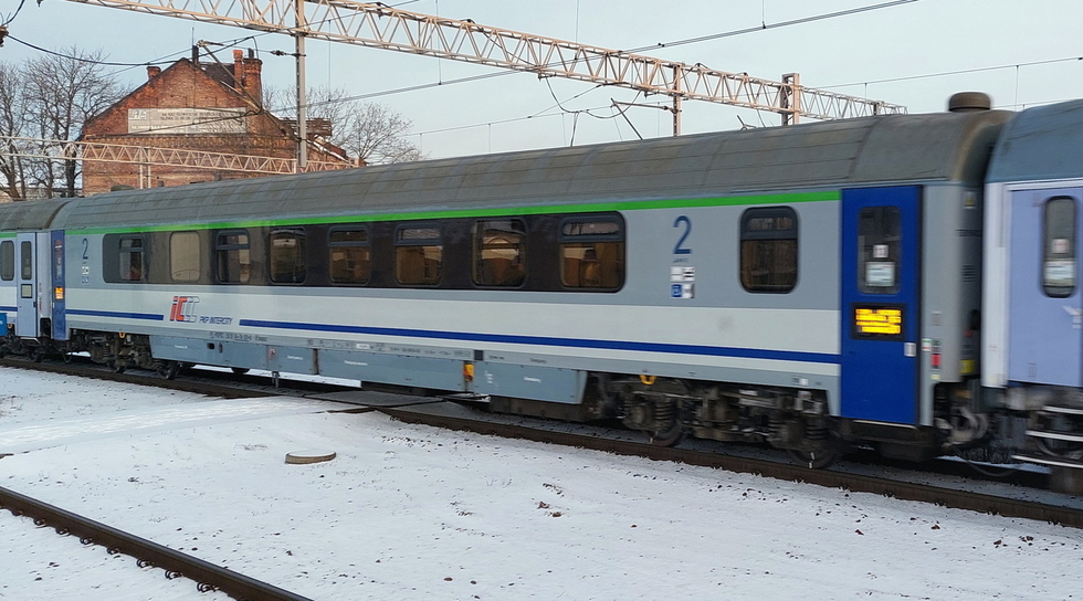 50 51 84-78 058-1 B7bnopuz wagon pasażeski 2 klasy typu 111Arow w składzie pociągu IC Malczewski relacji Kołobrzeg – Kraków Główny, 25.02.2025r. Gliwice.