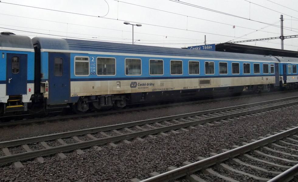 73 54 21-91 036-6 Bmz.241 wagon pasażerski 2 klasy w składzie pociągu EC Ostravan relacji Praha hl.n. – Žilina, 01.04.2024r. Český Těšín.