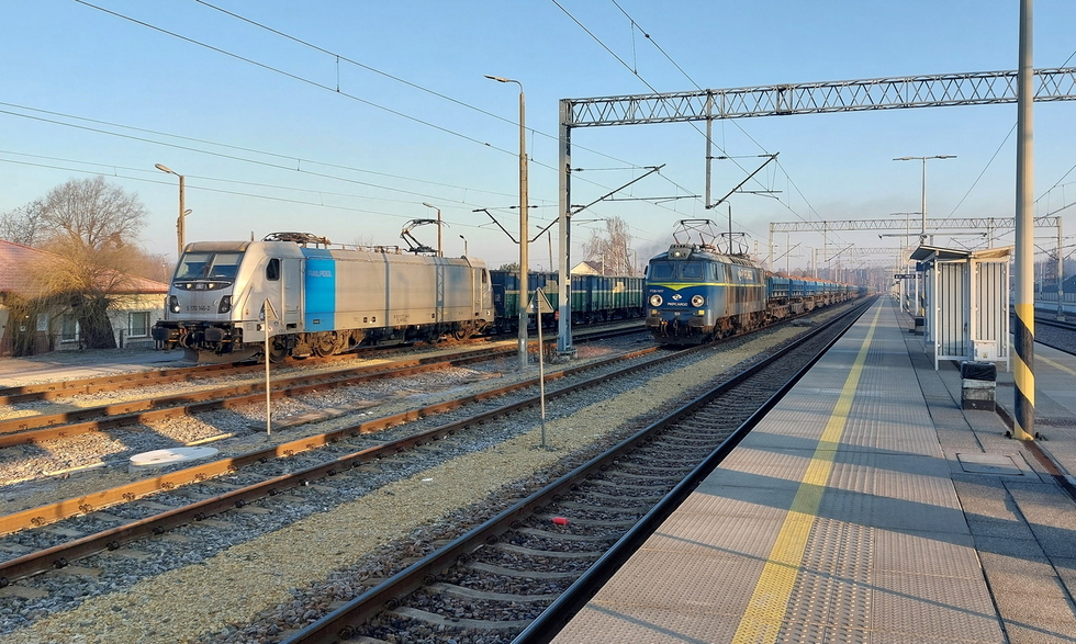 594-026 z składem węglarek i ET22-1217 z składem dumpacarów, 18.03.2025r. Żory.