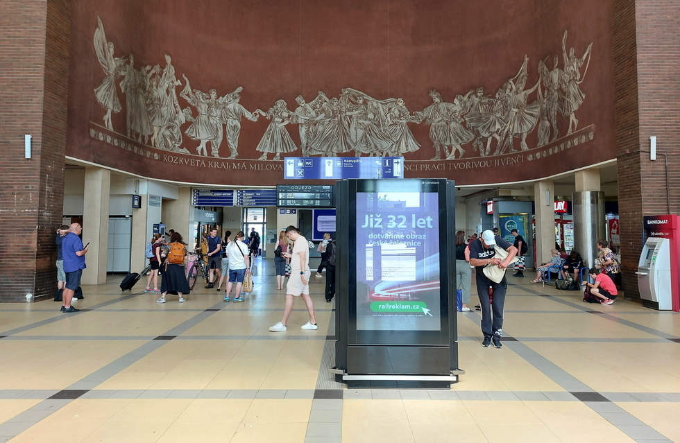 Jedna z wielu tablic informacyjnyvh na terenie dworca,15.06.2025r. Olomouc hl. n