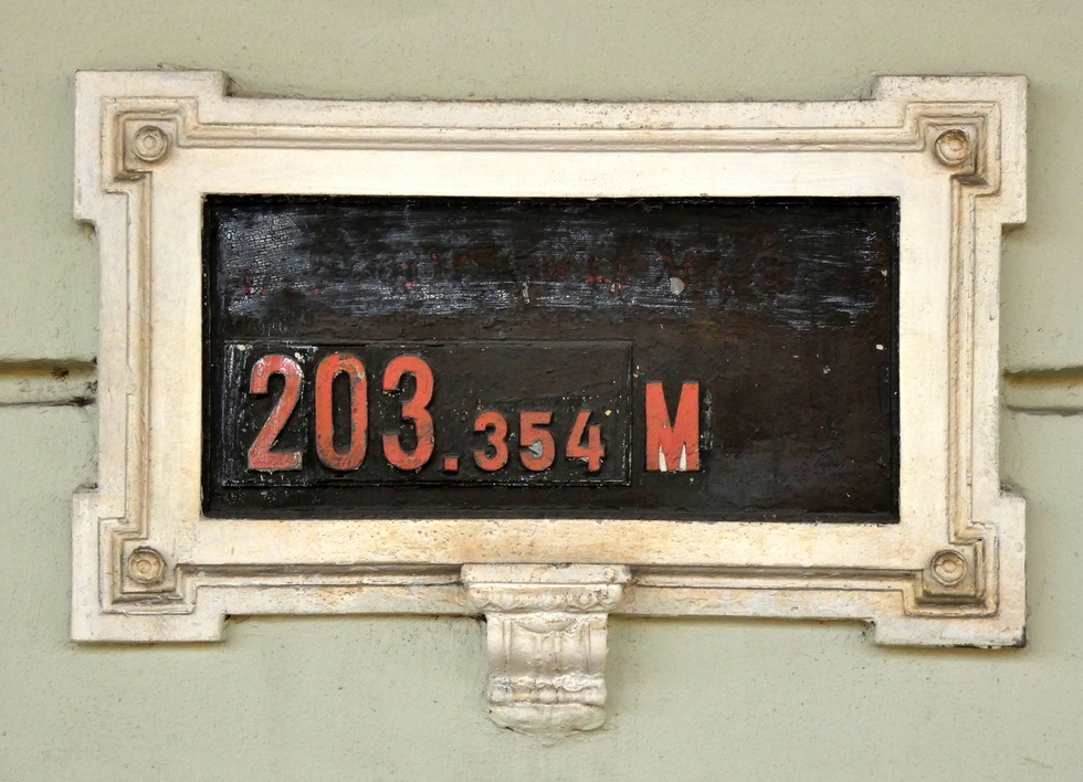 Tablica z wysokością budynku nad poziomem morza ( Adriatyku ) na budynku dworca w Bohuminie, 13.07.2025r.