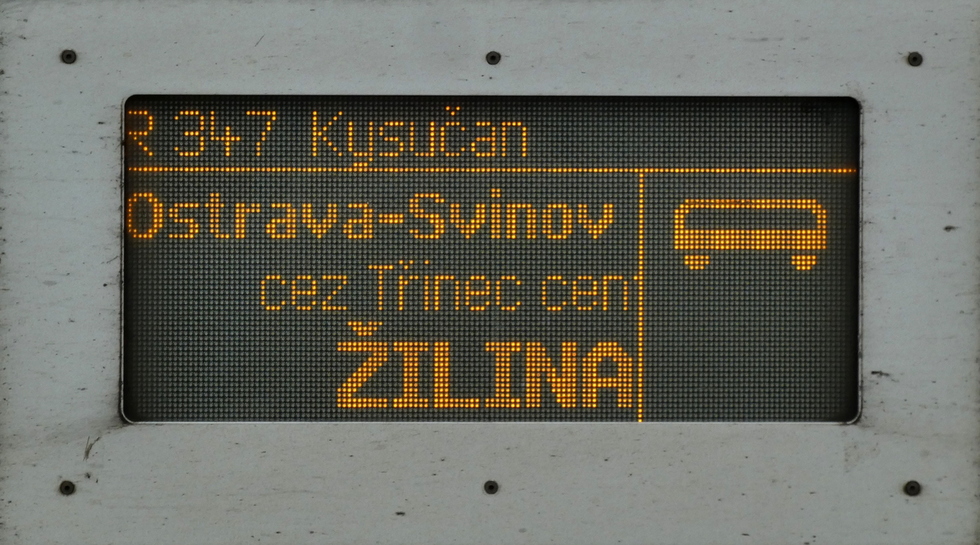 Tablica kierunkowa pociągu R Kysučan relacji Ostrava-Svinov – Žilina, 13.07.2025r. Český Těšín.