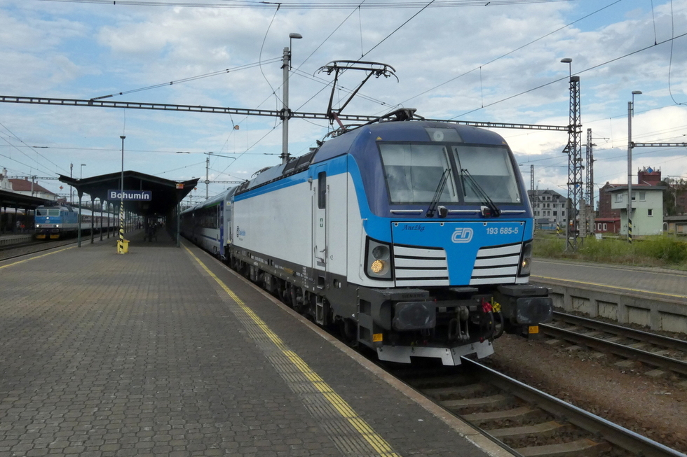 193-685 z skladem pociągu EC Silesia relacji Warszawa Wschodnia – Praha hl.n. 13.07.2025r. Bohumin.