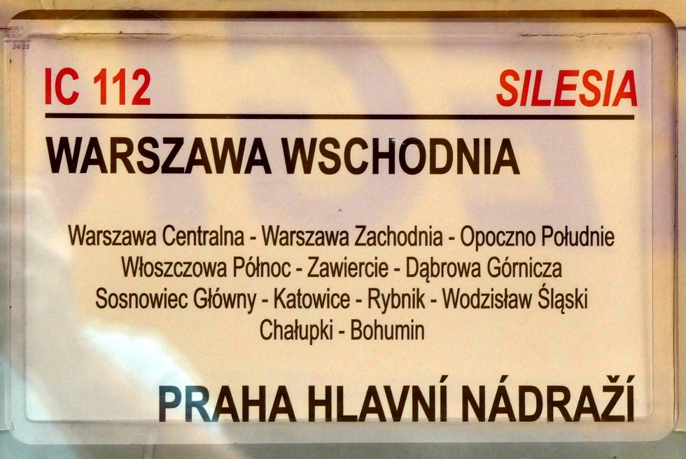 Tablica kierunkowa pociągu IC Silesia relacji Warszawa Wschodnia – Praha hl.n. 13.07.2025r. Bohumin.
