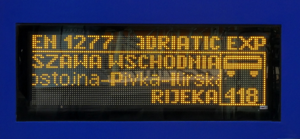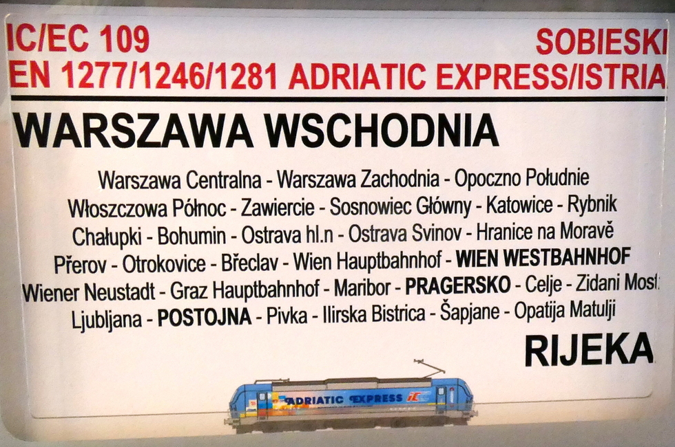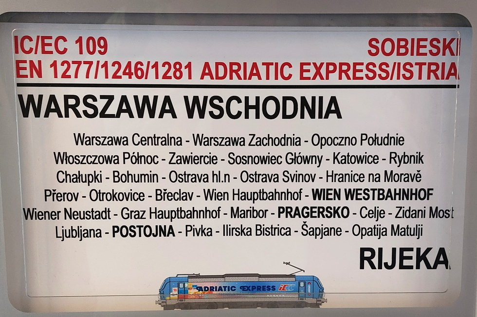 Tablica kierunkowa pociągu IC Adriatic Express relacji Warszawa Wschodnia – Rijeka, 13.07.2025r. Bohumin.