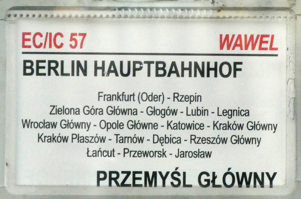 Tablica kierunkowa pociągu IC Wawel relacji Berlin Hbf, – Przemyśl Główny, 29.08.2025r. Gliwice.
