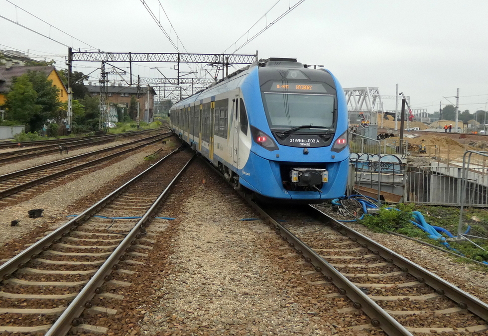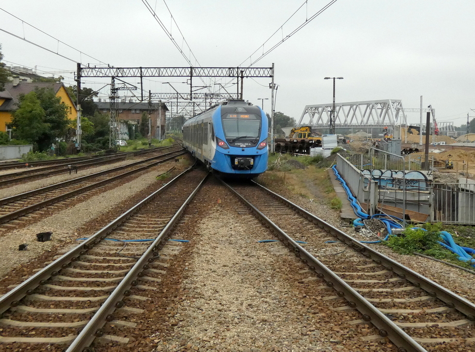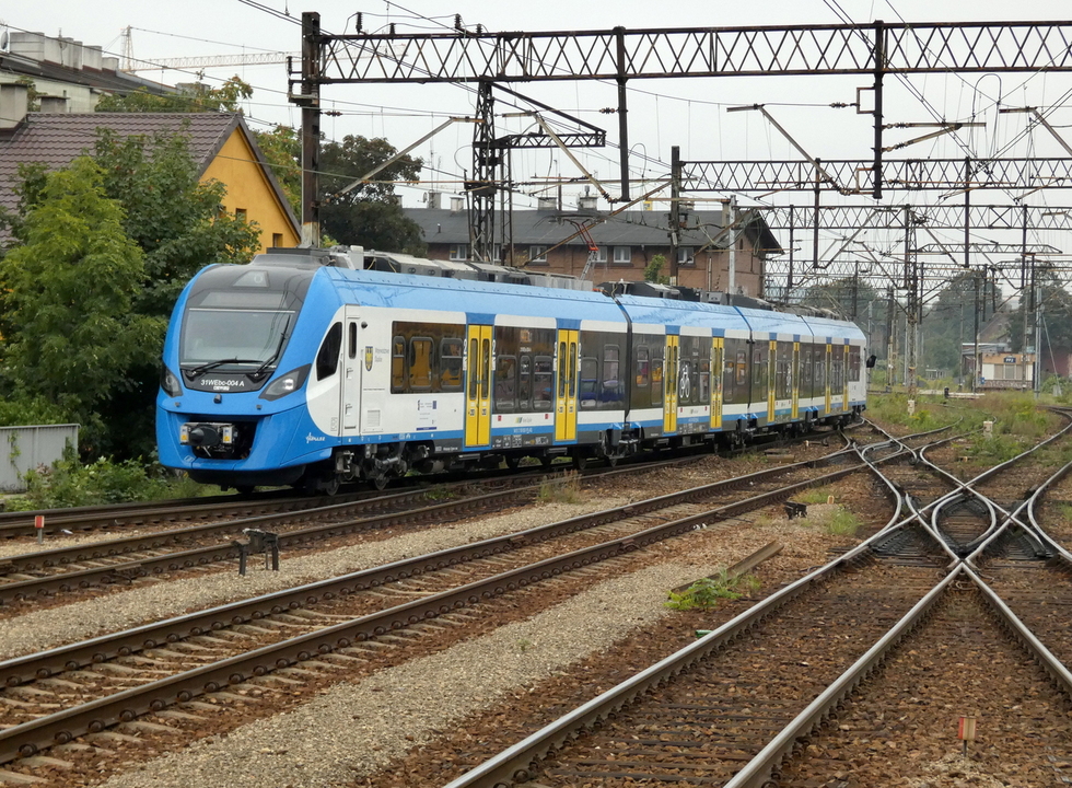 31WEbc-003 KŚ jako pociąg relacji Katowice – Racibórz z widokiem na modernizowaną stację, 08.09.2025r. Katowice.