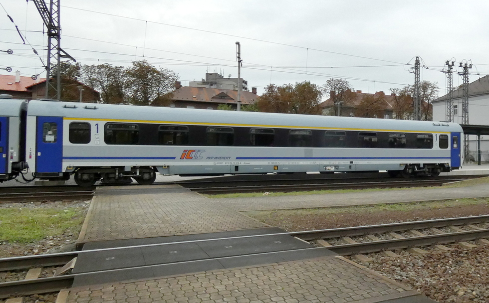 61 55 19-91 305-2 Amz wagon pasażerski 1 klasy w skladzie pociągu EC Báthory relacji Warszawa Wschodnia – Budapest-Nyugati, 27.09.2025r. Bohumin.