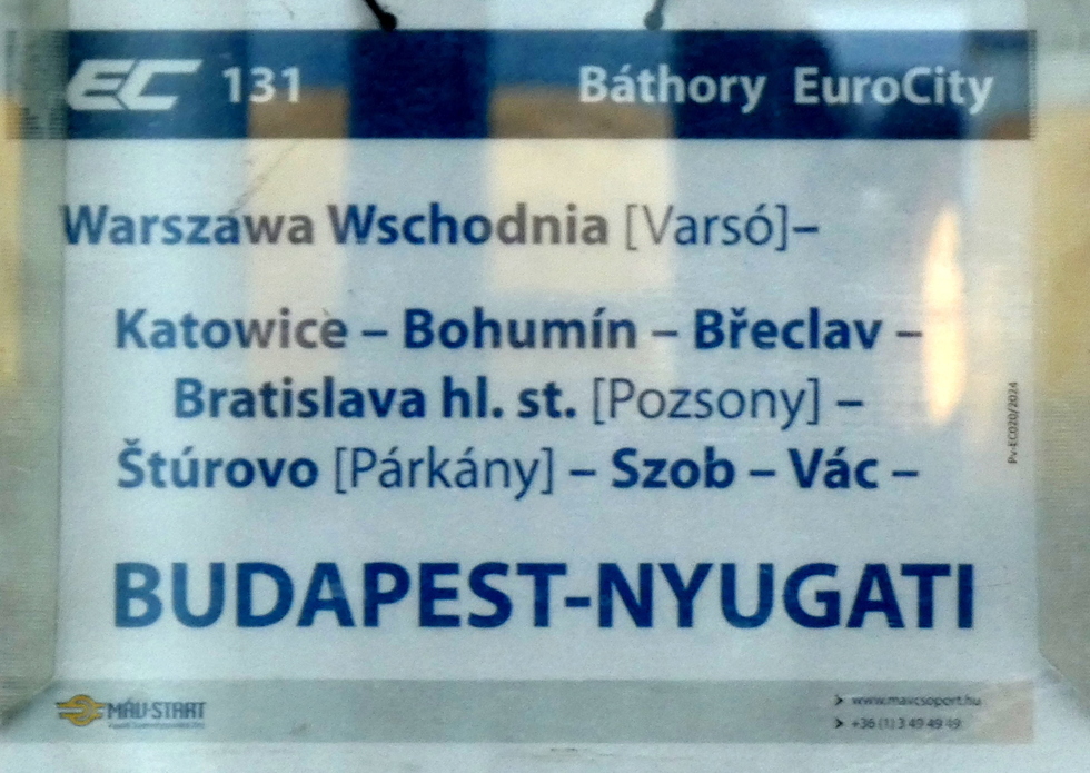 Tablica kierunkowa pociągu EC Báthory relacji Warszawa Wschodnia – Budapest-Nyugati, 27.09.2025r. Bohumin.