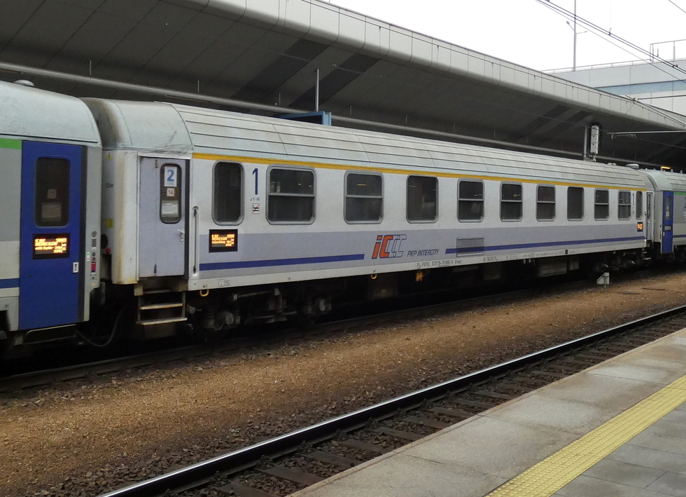 61 51 19-70 218-6 A9mnouz wagon pasażerski 1 klasy typu Bautzen91 w składzie pociągu EC Polonia relacji Warszawa Wschodnia – Wien Hbf. 27.09.2025r. Bohumin.