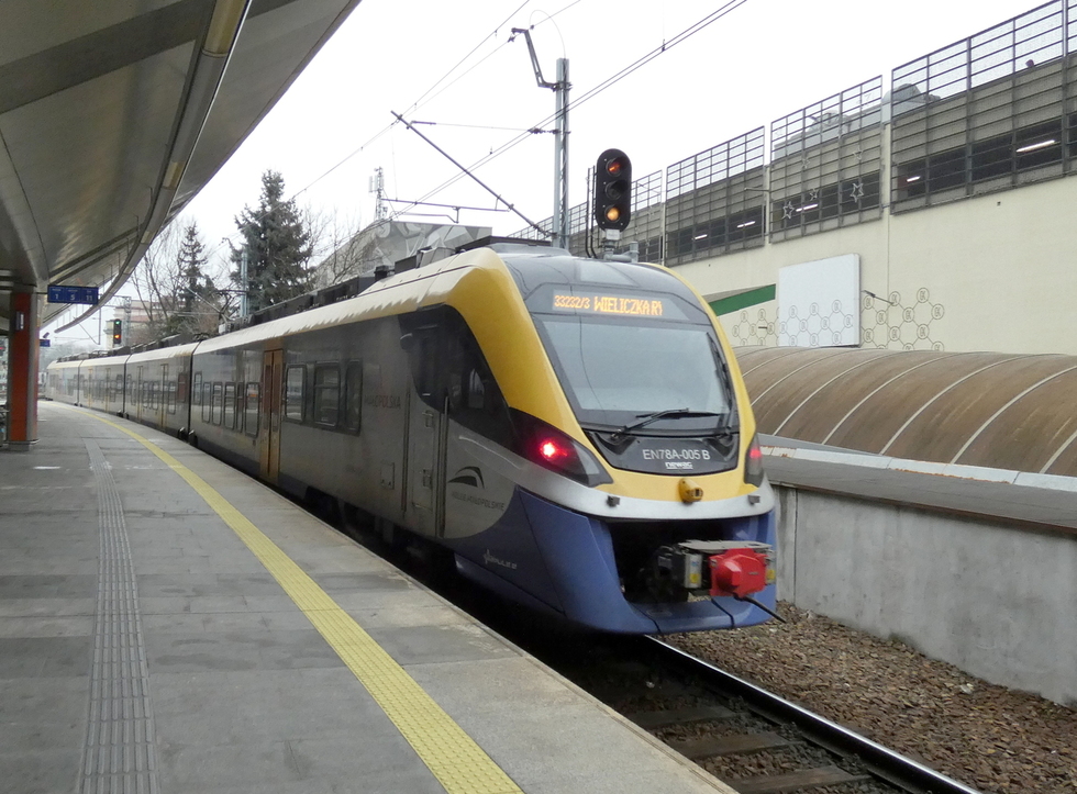 EN78-005 KMŁ jako pociąg relacji Kraków Lotnisko – Wieliczka Rynek-Kopalnia, 02.12.2026r. Kraków Główny.