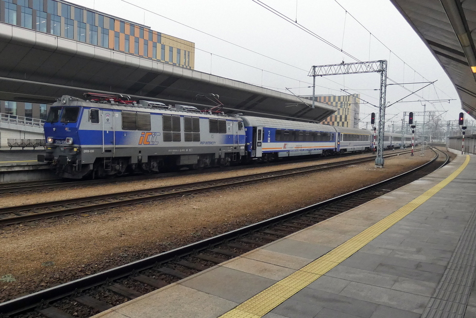 EP09-030 podstawia skład pociągu IC Matejko relacji Kraków Główny – Szczecin Główny. 02.12.2025r. Kraków Główny.