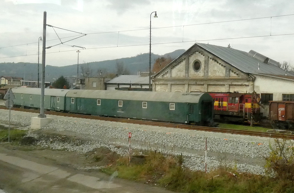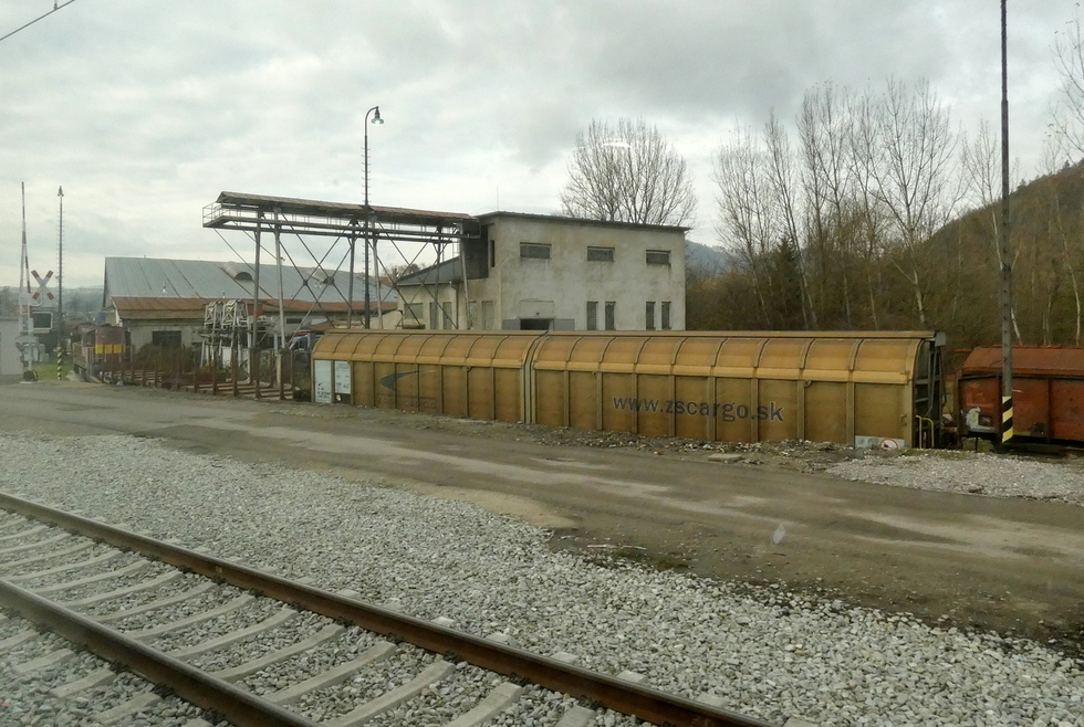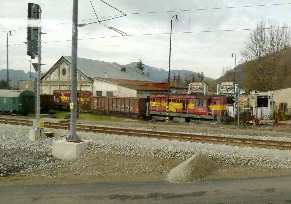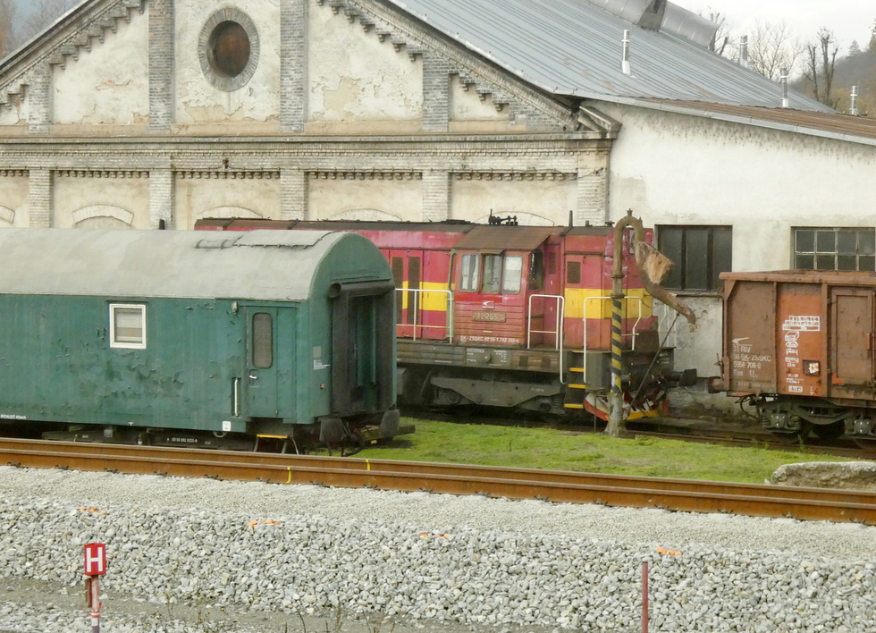 Widok z okna pociągu na tył lokomotywowni, 11.11.2025r. Žilina.