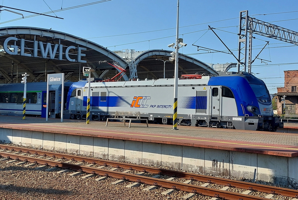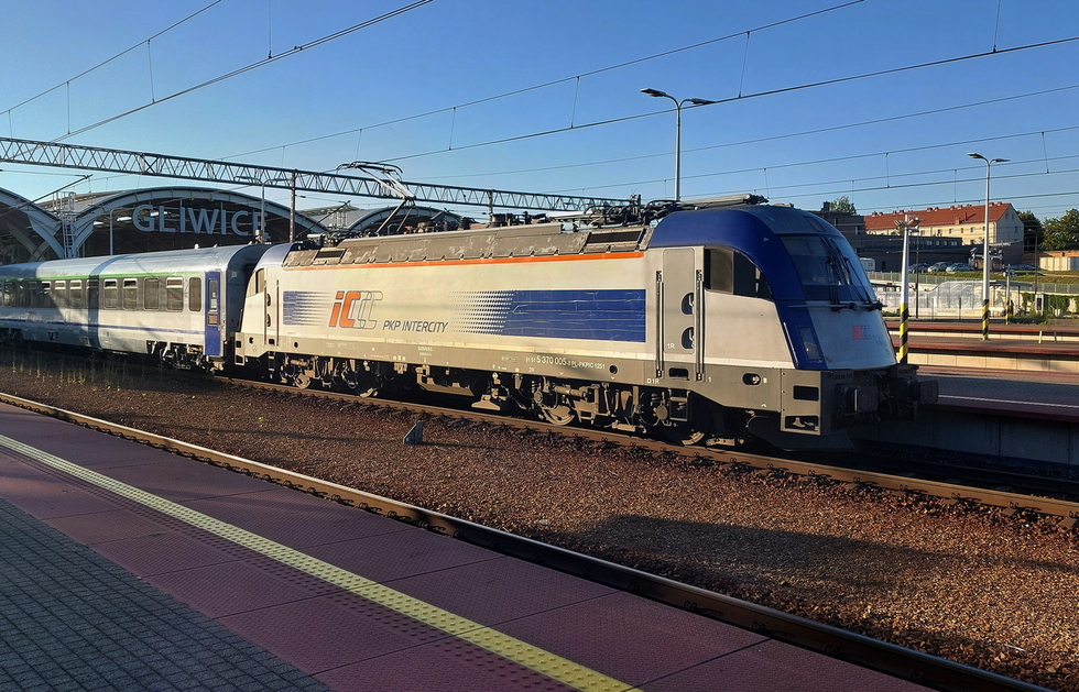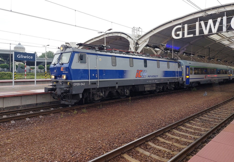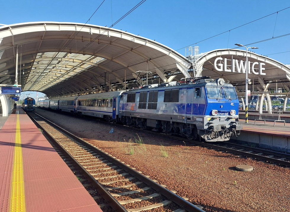 EP09-031 ze składem pociągu IC Rozewie relacji Hel – Przemyśl Główny, 28.08.2025r. Gliwice.