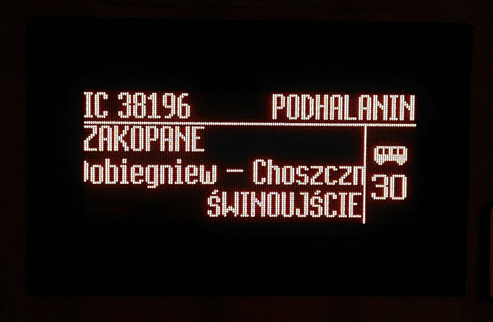 Tablica kierunkowa pociągu IC Podhalanin relacji Zakopane – Świnoujście, 29.07.2025r. Bielsko Biała Główna.