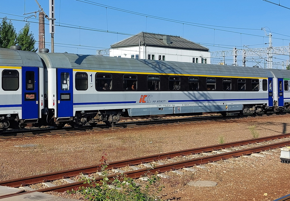 51 51 19-70 704-7 A9nouz wagon pasażerski 1 klasy typu 140A w składzie pociągu IC Malczewski relacji Kraków Główny – Kołobrzeg, 13.08.2025r. Gliwice.