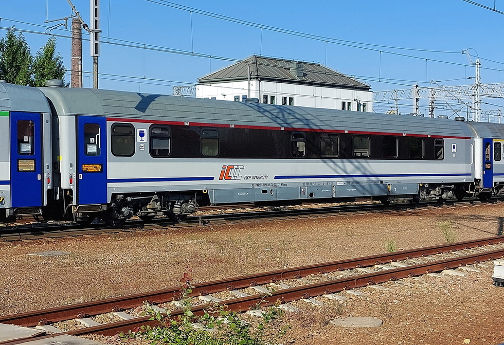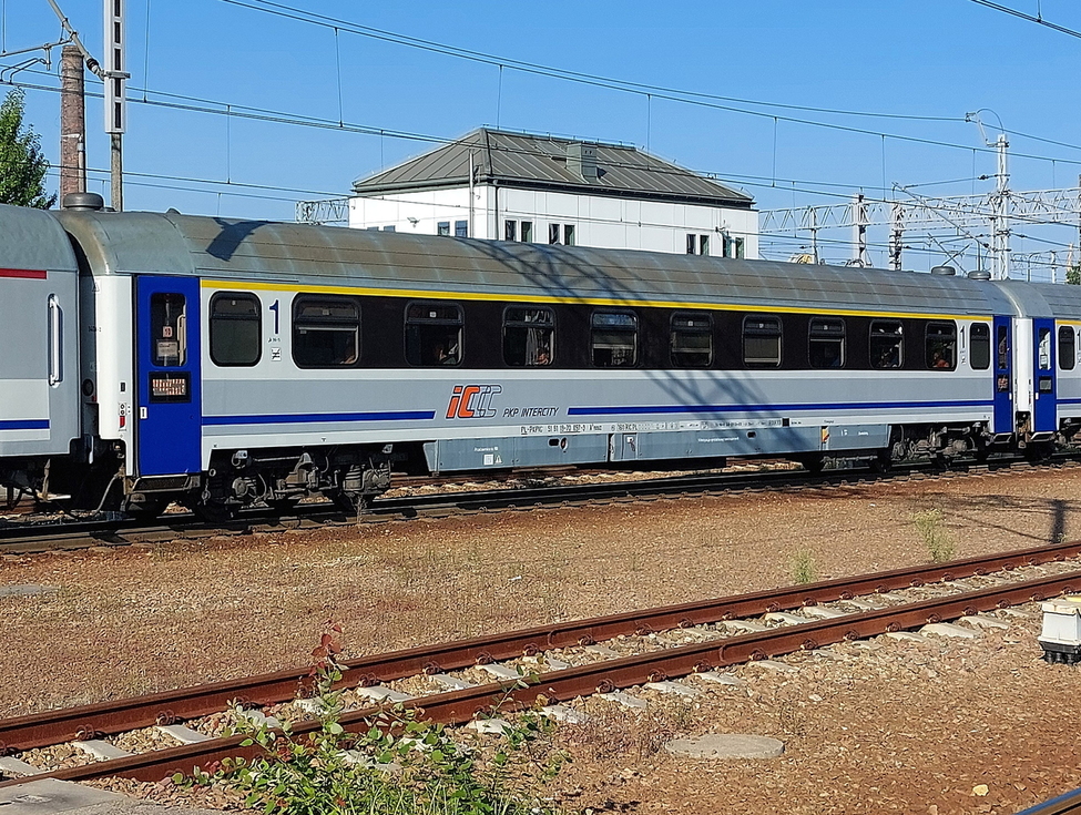 51 51 19-70 697-3 A9nouz wagon pasażerski 1 klasy typu 140A w składzie pociągu IC Malczewski relacji Kraków Główny – Kołobrzeg, 13.08.2025r. Gliwice.